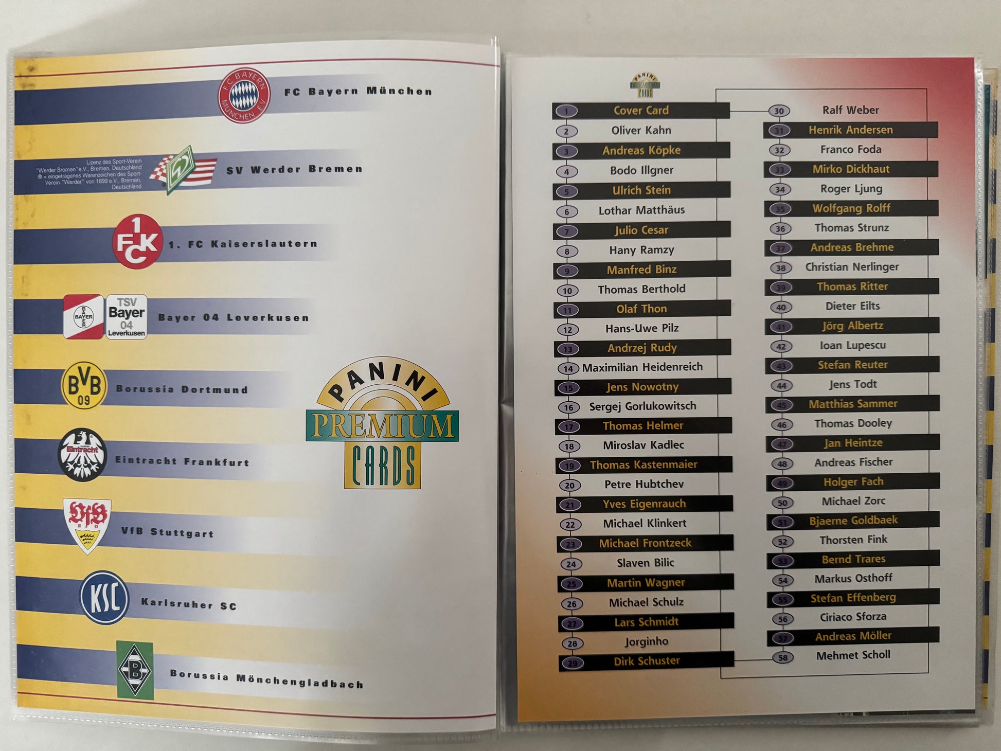 FC Bayern München, SV Werder Bremen, 1. FC Kaiserslautern, Bayer 04 Leverkusen, Borussia Dortmund, Eintracht Frankfurt, VfB Stuttgart, KSC Karlsruher SC, Borussia Mönchengladbach, MSV Duisburg, 1. FC Köln, Hamburger SV, Schalke 04, Dynamo Dresden, SC Freiburg, VfL Bochum, Bayer 05 Uerdingen, TSV München 1860